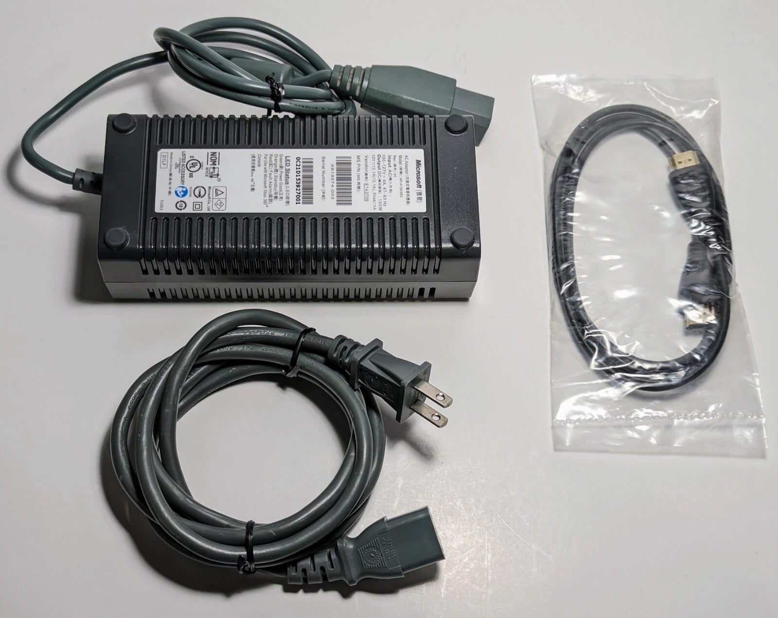 Genuine OEM Black/Gray Wireless Xbox 360 controller (fully refurbished) with new AA batteries, genuine AC power adapter, HDMI cable.